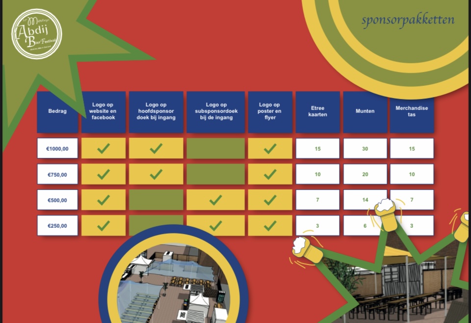 We hebben verschillende suggesties voor wat u als pakket terugkrijgt voor een sponsorbedrag, zie onderstaand schema.